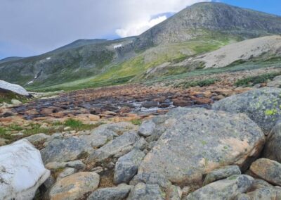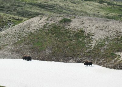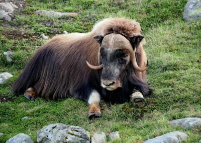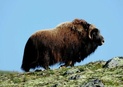 Le bœuf musqué est un animal qui semble tout droit sorti de la préhistoire. Il y a des dizaines de milliers d’années, les bœufs musqués cohabitaient avec les mammouths laineux dans les montagnes et les vallées de l’actuelle Norvège. Aujourd’hui encore, vous pouvez admirer cet animal primitif vivant et en pleine forme dans le massif du Dovrefjell. C’est le seul endroit en Norvège, et l’un des rares au monde, où l’on peut observer cet animal qui peut peser 450 kilos et courir à 60 km/h. pour une taille de 1,1 m et 1,4 m de haut. Sa toison brun gris peut atteindre une épaisseur de 80 cm sur le coup, le ventre et l’arrière-train. Les poils du dos mesurent environ 18 cm. Recouverts de cet épais manteau de laine, ils peuvent affronter des températures de -40 °C et des vents violents mais ne résistent pas à des pluies abondantes qui détruisent leur isolation thermique.