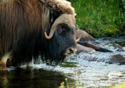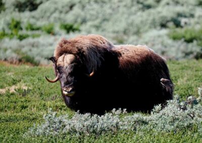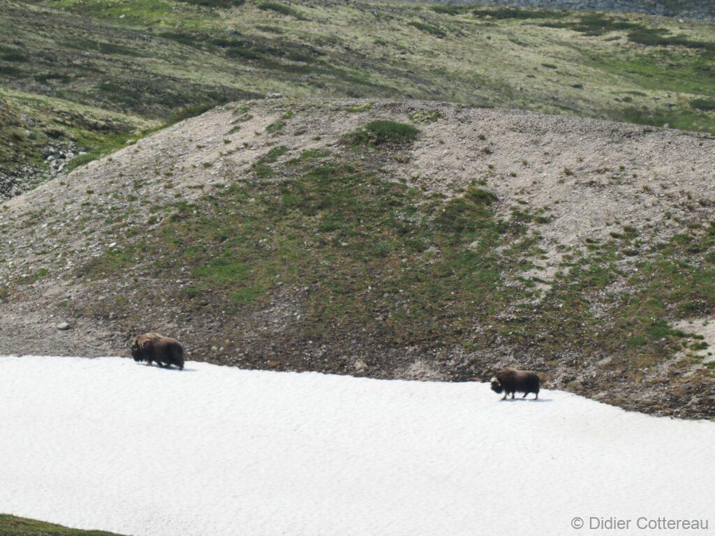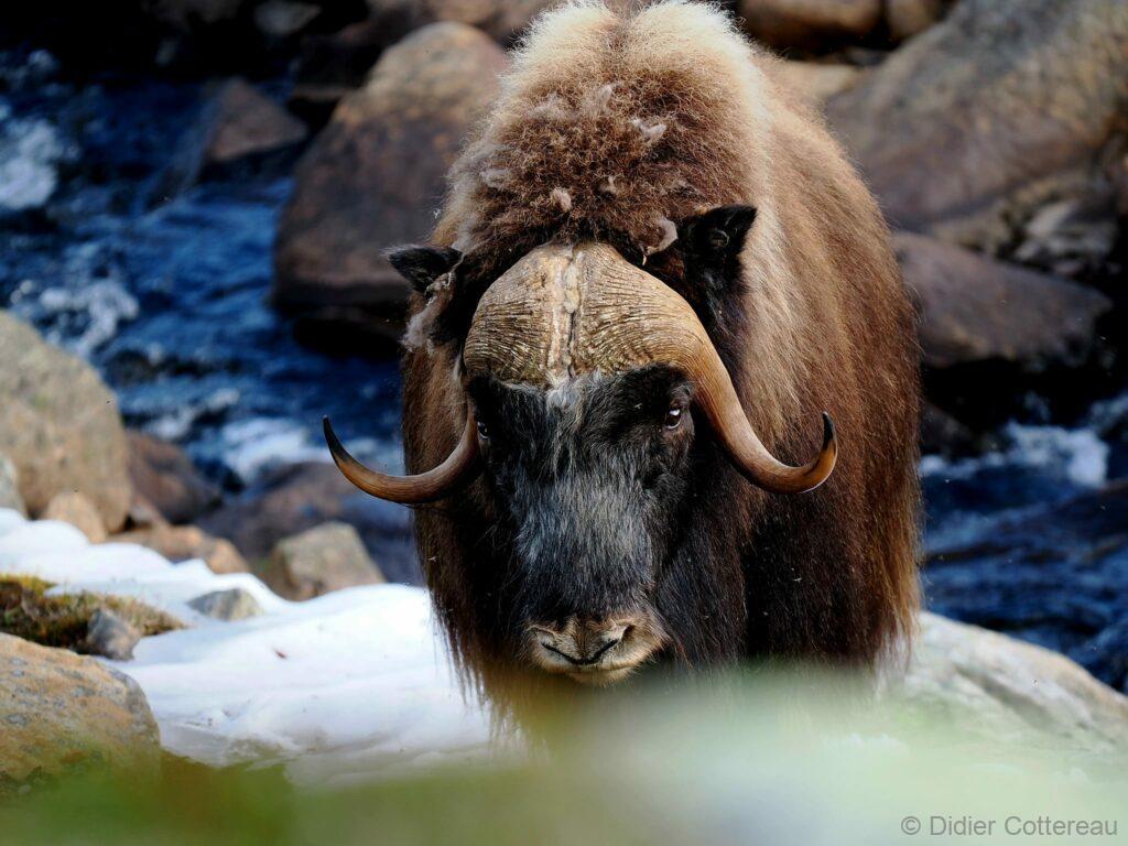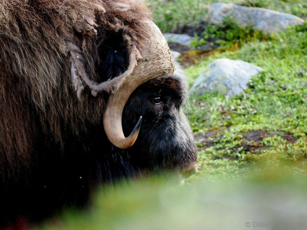 Le bœuf musqué est un animal qui semble tout droit sorti de la préhistoire. Il y a des dizaines de milliers d’années, les bœufs musqués cohabitaient avec les mammouths laineux dans les montagnes et les vallées de l’actuelle Norvège. Aujourd’hui encore, vous pouvez admirer cet animal primitif vivant et en pleine forme dans le massif du Dovrefjell. C’est le seul endroit en Norvège, et l’un des rares au monde, où l’on peut observer cet animal qui peut peser 450 kilos et courir à 60 km/h. pour une taille de 1,1 m et 1,4 m de haut. Sa toison brun gris peut atteindre une épaisseur de 80 cm sur le coup, le ventre et l’arrière-train. Les poils du dos mesurent environ 18 cm. Recouverts de cet épais manteau de laine, ils peuvent affronter des températures de -40 °C et des vents violents mais ne résistent pas à des pluies abondantes qui détruisent leur isolation thermique.